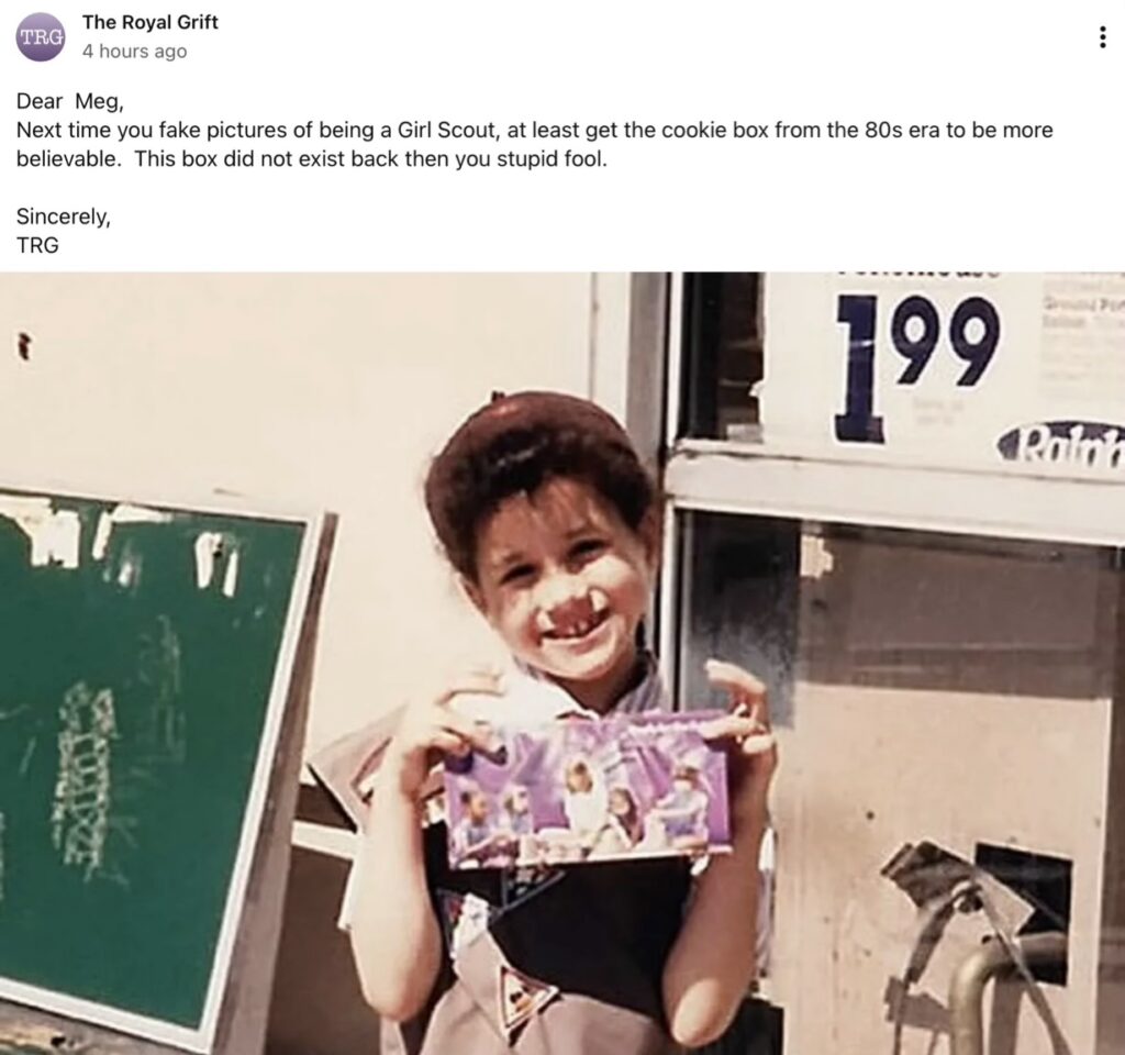 Toods writes: “I love Grifty! You may not be caught up with all the things going on with ‘those two’ creeps. But Unremarkelable is being her unremarkelable selfie and that Fuzzy One she is hitched to. Anyway…Grifty called her out regarding iconic cookies( biscuits) sold by a certain organization for girls unless of course if a boy( whatever that is) wants to join up, most likely.”