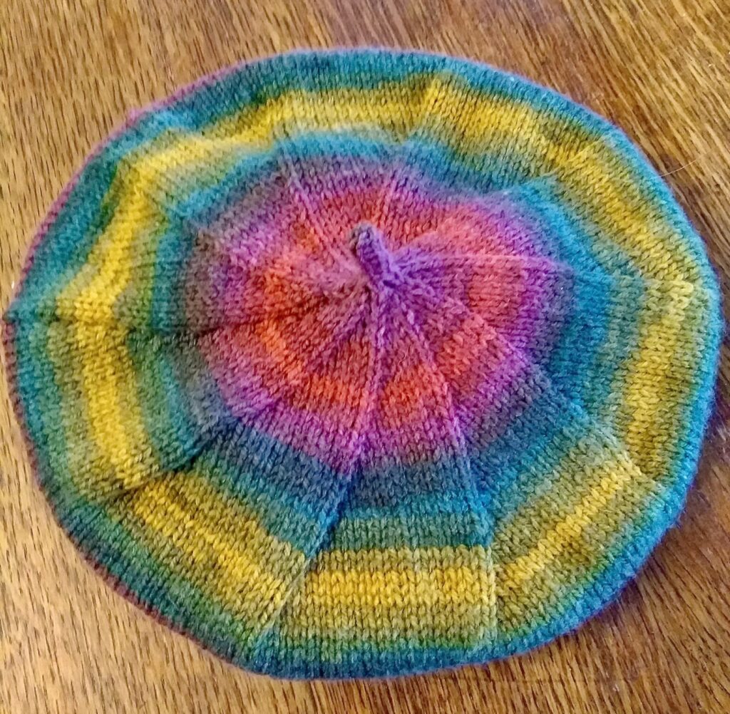 “Just lately my knitting has been diverted from socks to hats. Well, one hat. I knitted myself a beret. I probably ought to now burst into French but unfortunately je suis very bad at it. I was surprised at how easy it was to knit. I always thought of berets as very complicated, but it just looks that way. The wool I used is what they call self-striping – dyed different colours at intervals along the yarn, and when you knit it you don’t have to change colours, it just happens.”