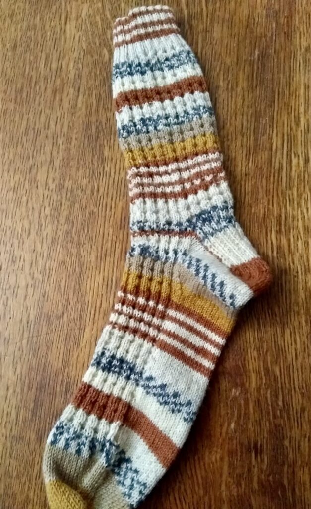 “I have, of course, still been knitting socks. I always have a sock on the knitting needles. Currently I’m knitting a pair of man’s socks and the pattern is called ‘hug me’. I think the name is because of the fancy ribbing that keeps the sock hugging your foot. But if my Beloved thinks it means he has to hug me when he wears them, that’s fine by me 😁 Again, the socks are knitted with self-striping yarn. I’m part-way through the second sock. When they’re finished, they will go to one of our recent visitors who took a liking to them.”