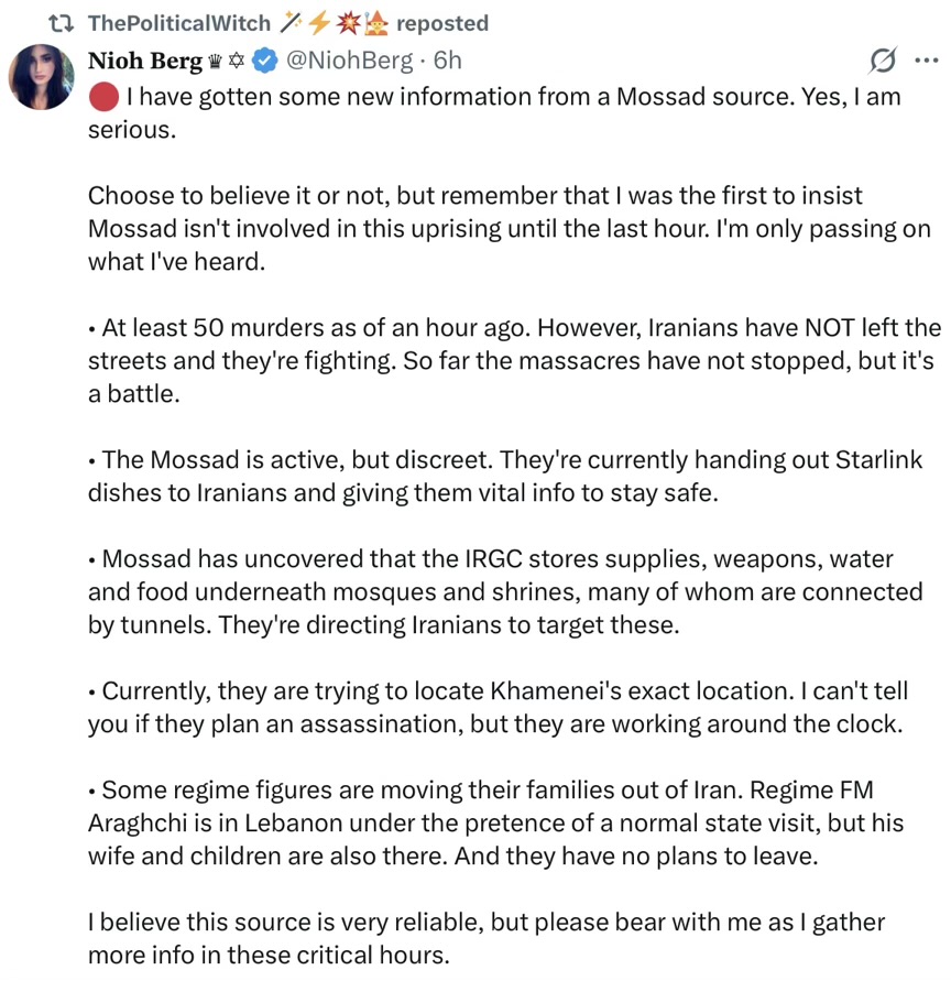 Nioh did write, at 1628: “While there are reports of massacres happening in Iran, I have now seen MANY Starlink messages with hopeful and optimistic reports too. Nothing can be verified, but have trust that the people of Iran: • still outnumber the regime • were ready for this blackout to happen • have significantly damaged the regime • are still fighting Please be careful with accounts pushing a purely doomsday narrative, because from what I’m receiving, it’s far less one sided than in the past. Be skeptical of accounts spamming videos of death and corpses, as we have no way to verify these, and the regime’s goal right now is scaring people into going home. Remember that the regime has in the past staged and exaggerated their own atrocities in the online space to stop people from coming to the streets. Beware of accounts sharing death videos while people inside Iran are also sharing positive messages of victories and achievements. In the coming posts I will spread positive Starlink messages from inside Iran. Though unverifiable, the people there must have hope and strength. I will not manifest another November 2019. It’s NOT as black and white as you think.”