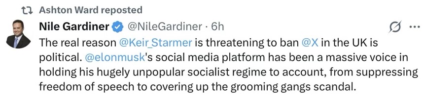 All right … we need to adjust to this possibility. Readers know I heavily rely on X, esp. for sshots. Should that be closed down, as Gab was and they’re trying to do it with the rum platform too, hence my cautiousness … it would throw a spanner in the works but there are “workarounds”.