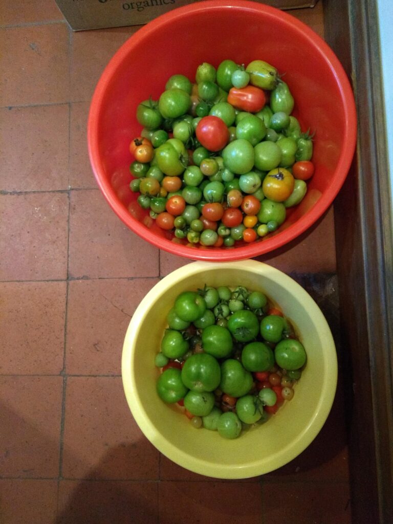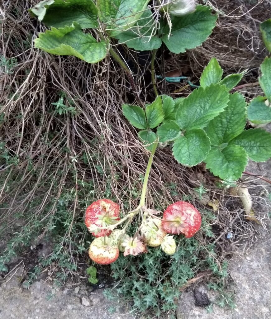 They were all green, though some have turned red now. I shall set some aside to eat now and the rest I shall bottle. We had a better harvest than I expected. On the way to check the tomatoes, I discovered that we have some late strawberries. Sadly, all but one had been eaten by the woodlice. Beloved and I had the good one between us.