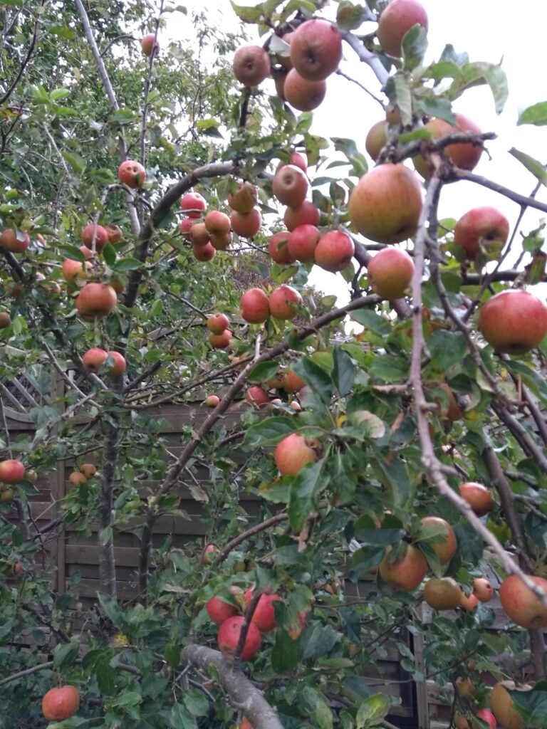 We’ve had stormy weather here just lately, with quite strong winds. I have been amazed that the apples have still remained on the trees! The yew berries from a tree up the street are thickly over the road, but our apples are making us work to get hold of them! We have SO many apples. We took a large bag each to the local cafes, who were over the moon to receive them. And that’s just the cooking apples. The pippin is also overflowing and we must bring those in next time we have a free moment – and a bit of dry weather.