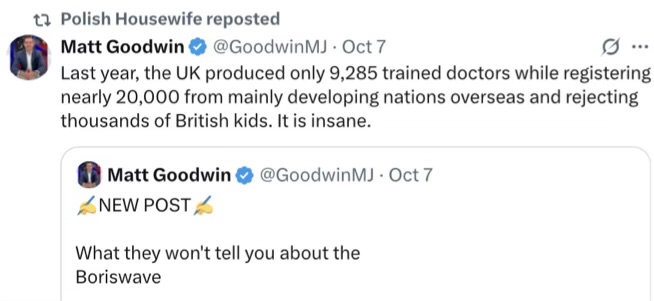 It’s the source for me, or rather the reposter. I used to see PH at N.O. and look up the topics she brought … Vicky is such a one today, Sarah for North America. These reposters are sound people, sane politics, levelheaded … any punter needs such people. Chris Rose above is a black conservative … also useful. Matt Goodwin is iffy as he’s Reform inner sanctum with Yusuf.