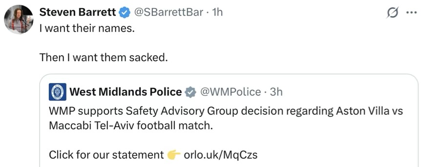 A possible solution to the Aston Villa v Maccabi Tel Aviv problem, is to ban everyone from going, apart from a few tv cameras. Let them play in an empty stadium. If the AV supporters complain, and they will, they should be directed to the local mosques, for starting the threats to the TA supporters.
