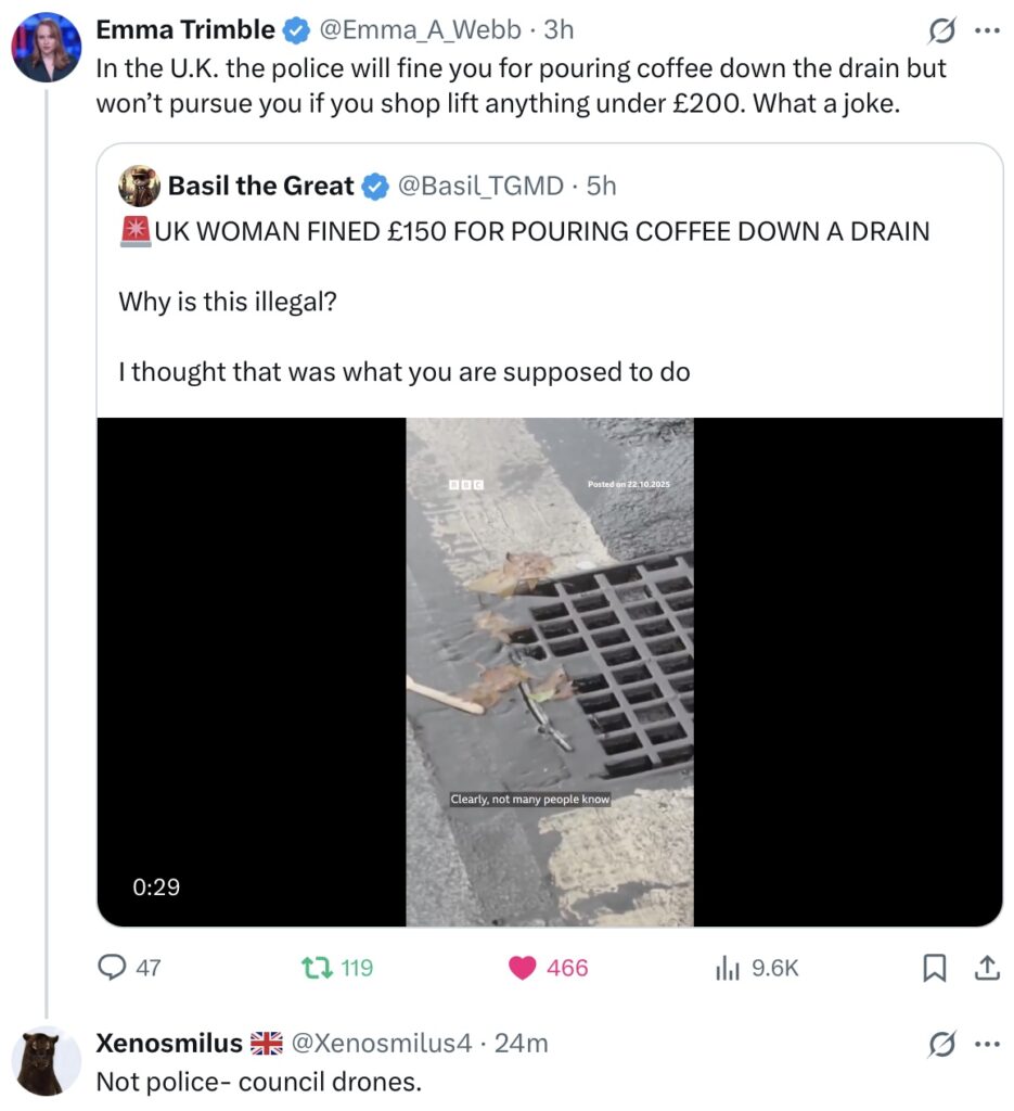 7. The council would have to prove it was coffee. Pouring water into a drain made to collect water is not a crime. Anyway, do not give them your name and address or engage in conversation. As these wardens have no powers of detention, they can’t stop you walking away.