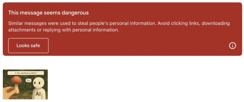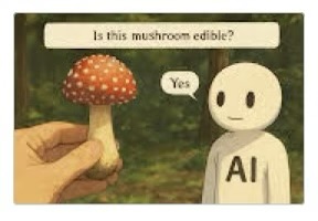 Next panel has the guy on the left in bed, in agony, and AI says, “Yes, some mushrooms ARE poisonous.”