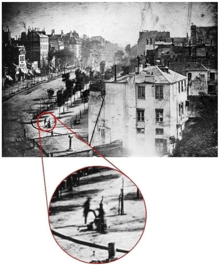 This photograph is the first in which a person appears in front of the camera and is also the first photo of the city of Paris. The used camera needs about 5 minutes to collect the light and scene. The street was full of people, but as they moved during the shot they failed to impress themselves in the photo except for one person who stopped for a few minutes to shine his shoes and history immortalized him. It was the year 1839.