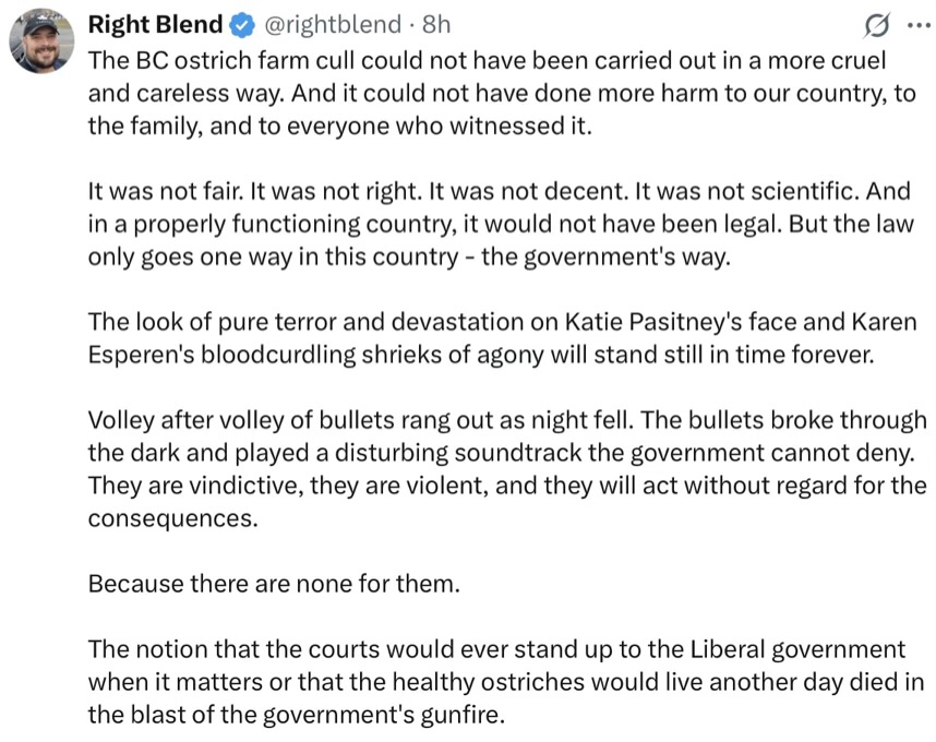The shooting of the ostriches in BC was done last night under cover of darkness. Appeals had been made to the Supreme Court who simply refused to hear them.