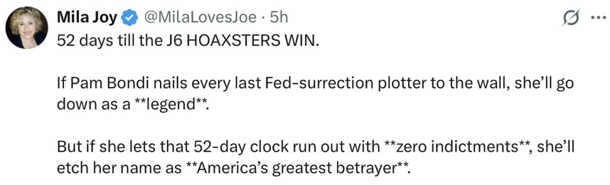Bondi has done nothing, seems unlikely to, nor does DJT … lately, he “ordered” her to. Uh huh … by what authority can she ignore this order? It just doesn’t read right. Then his apoplectic attack on MTG, whom I agree is iffy … but why now and why so vehement?