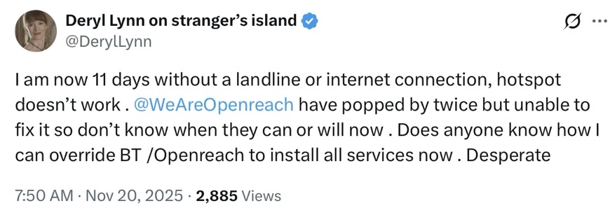 Re #16 – Openreach operate the old BT landline network on behalf of numerous ISP’s. So unless you have Virgin Media or one of the smaller fibre company networks passing your property you are stuffed. If Deryl Lynn has a good signal from one of the UK mobile phone networks then a cheap 4/5G router is the quickest way to get back online. I’ve got one of these, and it works well: