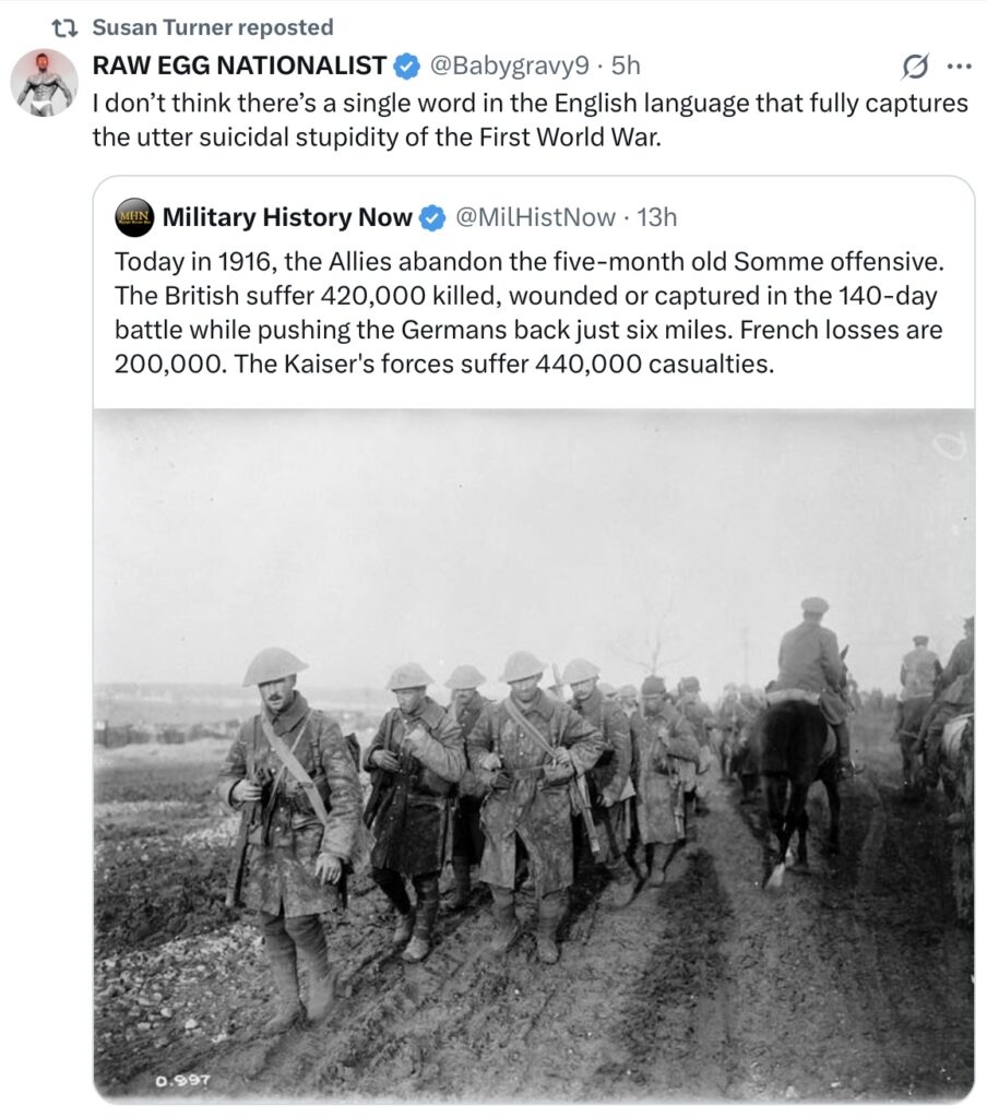 … but I missed posting it I think, and it appears again. Who in their right mind thought trench warfare was the way to go with largely patriotic youth signing up and white feather women roaming around back home, handing them out?