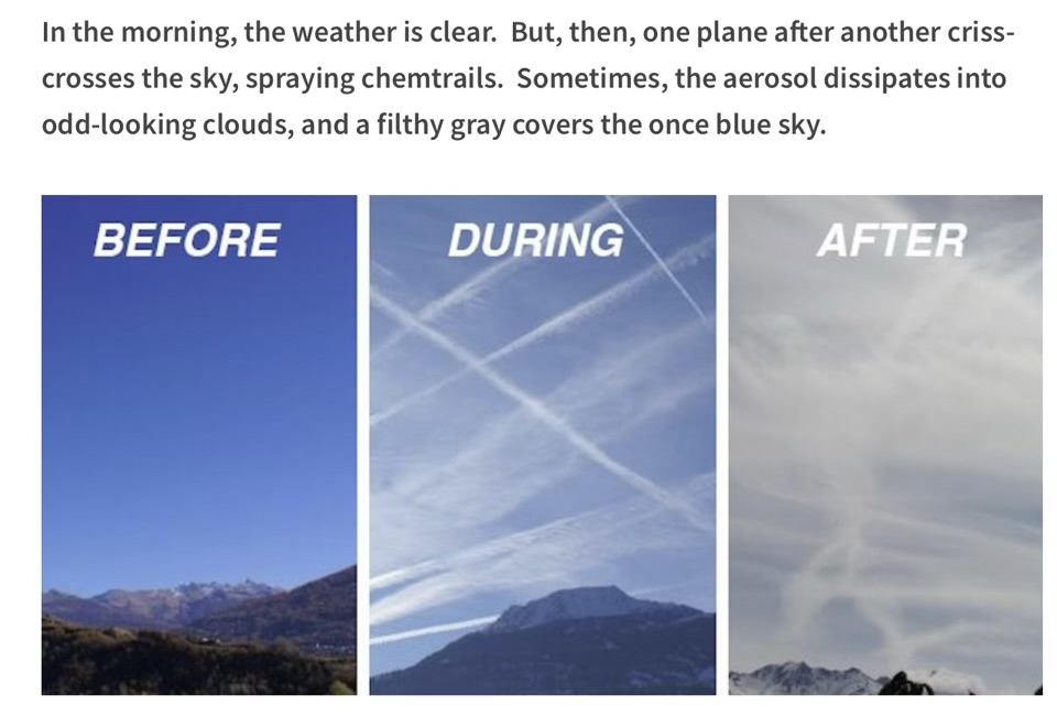 Yes, he replied, they’ll have to find some new way to power aircraft. I just looked at him. What planes spew two white tails in criss-cross patterns across the sky? He was either nonplussed or deeply in denial.