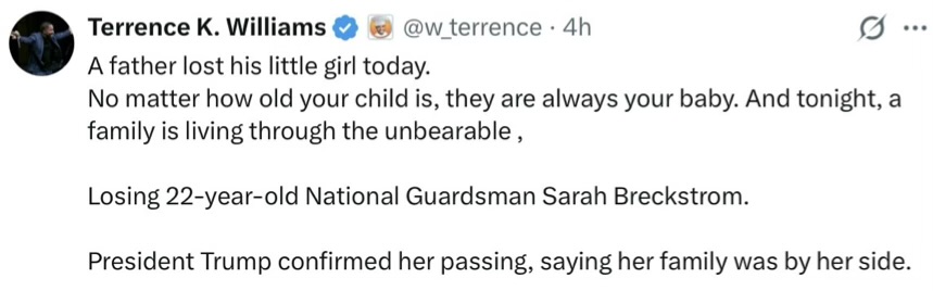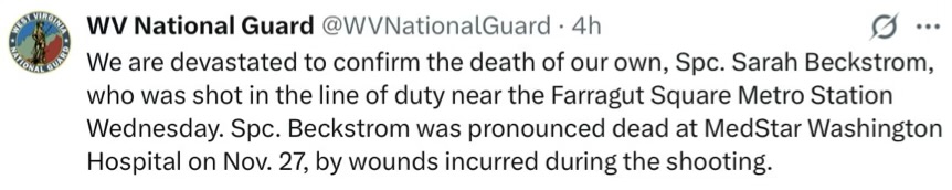Last night our time, her father made a statement that as one of the two other guards shot, she was not likely to pull through, not to last through the night, damage was too severe. Presumably he went out to tell reporters, family in around her bed.