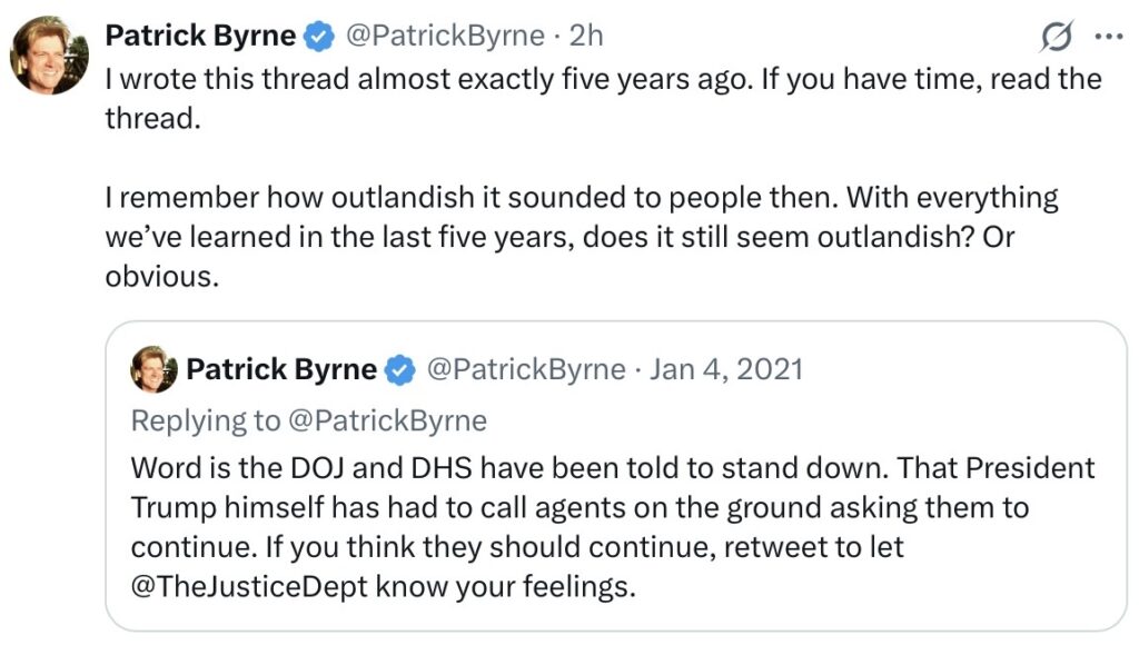 Patrick Byrne is an anomaly. Hardly respectful towards much of DJT’s doings, he’s still essentially onside with MAGA … former cyber badboy … weeeell, at least see what happens … he’s in with Emerald.