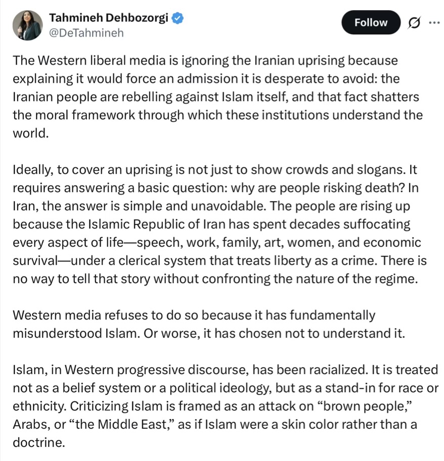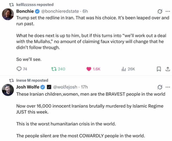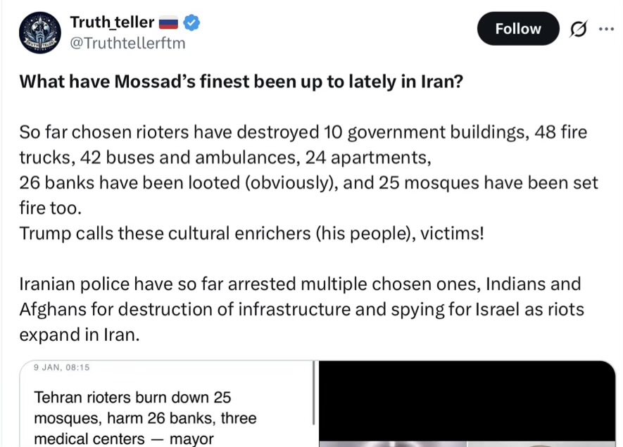 For example, I was over at Gab last night, looking around, and most on the topic were almost neo-nazi, slamming Israel, calling it a Zionist operation, while the other side, Russia, not seen at all over there, say it’s the same US playbook each and every time. What they don’t add is “thereby letting the mass murdering mullahs off the hook yet again”.
