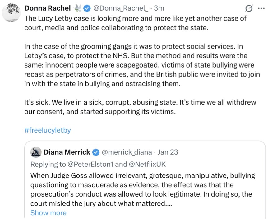 In this majority (I believe) are many currently Reform but who see no alternative (middling normies in deep shock are these Reforms-for-now), plus us who do deep dive a bit. Names include Donna Rachel (hardline anti-rape-gang, as a former victim), Jess Gill, Charlotte Gill, Wendy Patterson, Harry Rag, I’ll add more names later.