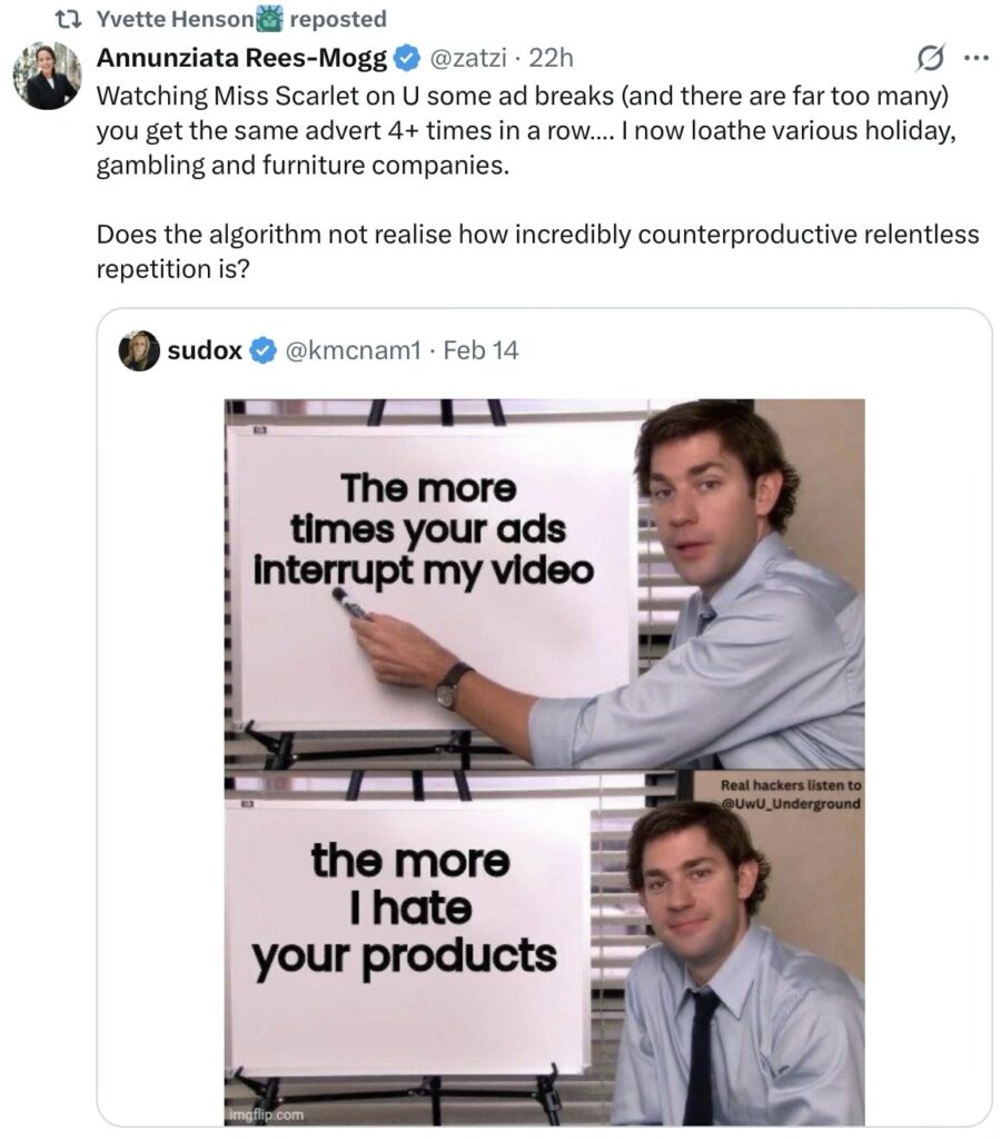 I replied: “Absolutely. I can just about stand the TUA travel ditty … at the other end is anything with the wrong demographic for the scene.”
