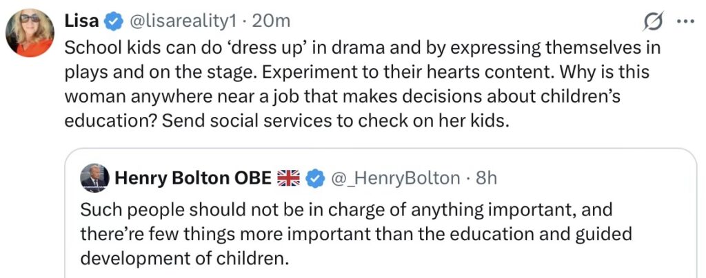 And Lisa over here, on the woman who said boys should try out wearing dresses at school: