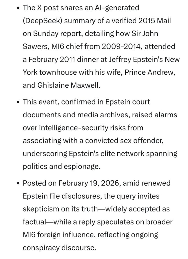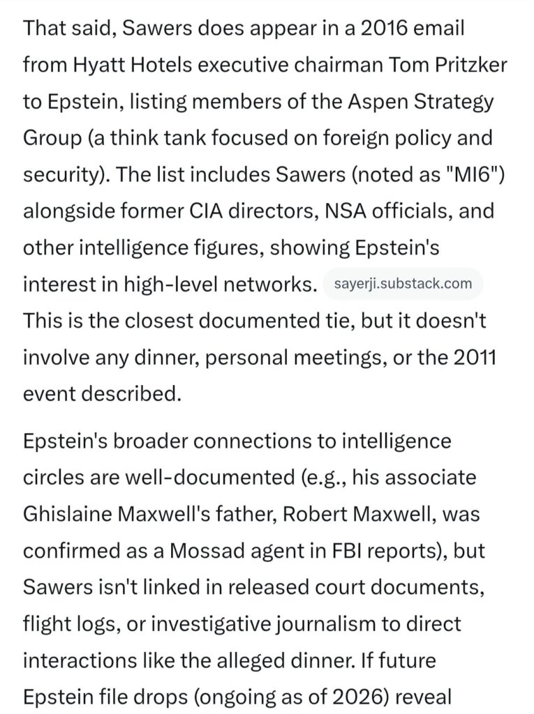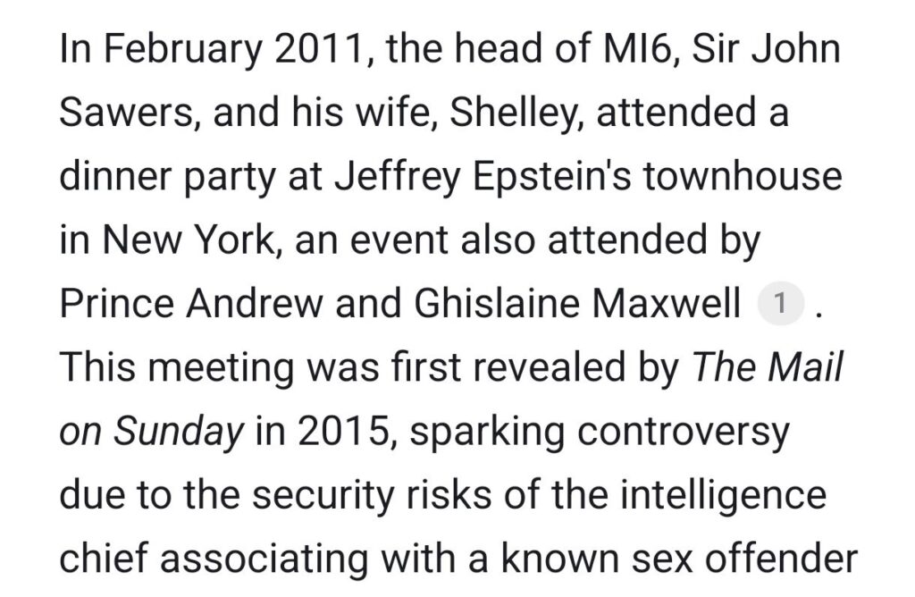 “Why did the head of MI6, Sir John Sawyers, attend a dinner with Ep, Maxwell and P Andrew at E’s New York townhouse after E had been convicted of child SA?…………”