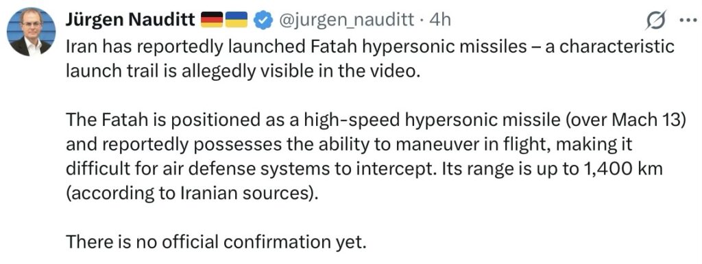 “Israeli defense systems fired at least 9 times trying to intercept, without success, 2 Iranian missiles that reached their targets in Tel Aviv. Up to this moment on the first day of the war, Iran has fired fewer than 20 missiles and a few dozen drones toward Israel, but with a high success rate for the missiles, hitting various locations, some of them civilian areas.”