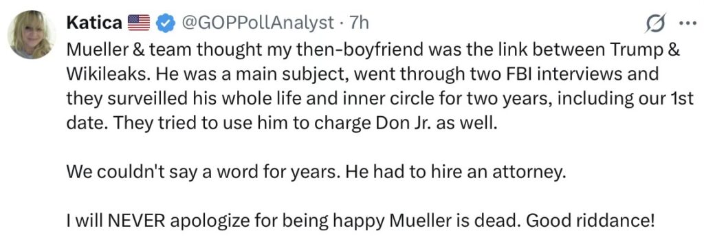 The major story is Mueller’s death and Donny’s “ungracious” comment yesterday. The Lydia girl featured yesterday, goodheart, dead against full term abortion (agreed), nevertheless said there was no call to say hurty things to Mueller.