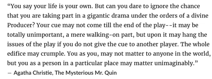 Fourth thought to enter the head was to retrieve this quote from Agatha Christie’s Harley Quinn who, in one short story, has a little ole man, Mr. Satterthwaite, stumble upon a woman about to leap from a coastal cliff where her now empty house is … setting is Italian coastline, maybe Capri, maybe not. He addresses her about it: