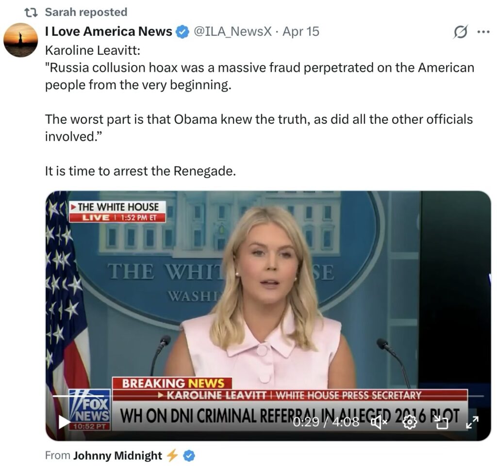 It’s from a Johnny Midnight, using a Fox broadcast which I’ve taken a sshot of … presented by ILAN … did she really call Obama out by name? And in what context? I must go back to X and check.