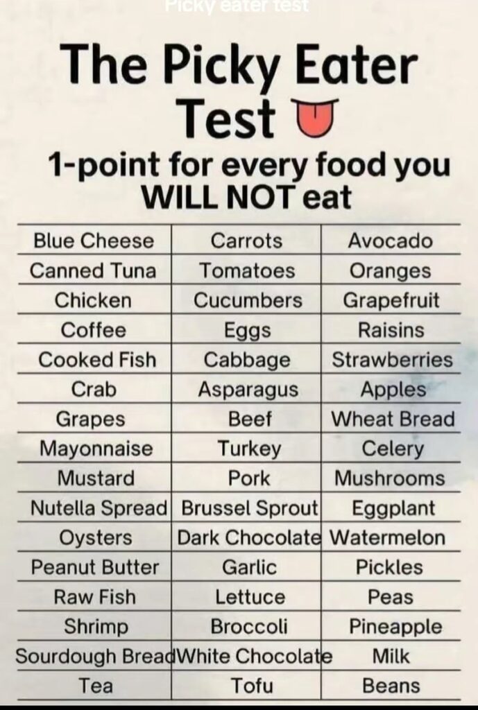 I cannot eat Oysters, cooked cabbage (I love it raw) or spinich. I have never eaten sourdough and eggplant, so I don’t know. I am very unkeen on white chocolate, mayonnaise, mustard and brussel sprouts.