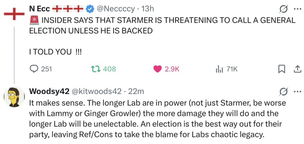 Do you remember, at the start of Starmer’s term, that at the end of one session, he wandered over to the opposition benches and chatted to Farage? It’s on film. Yesterday, he was saying that at the next GE, it would be Reform v Labour. Now this: