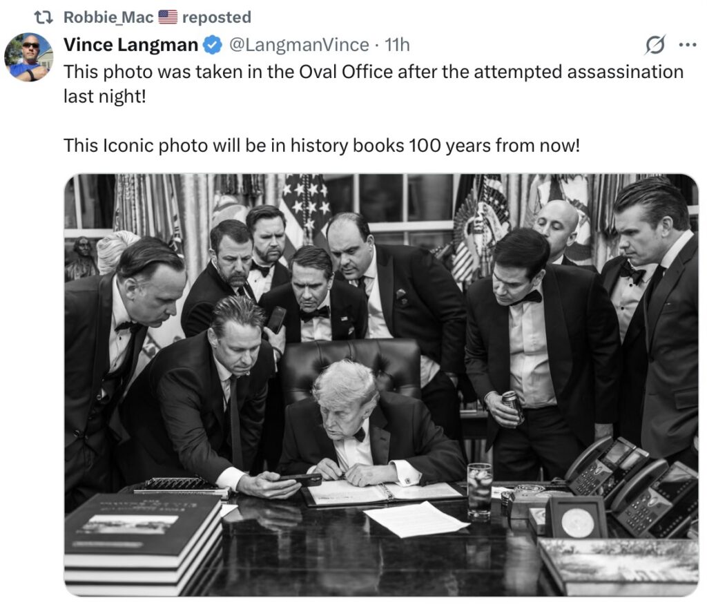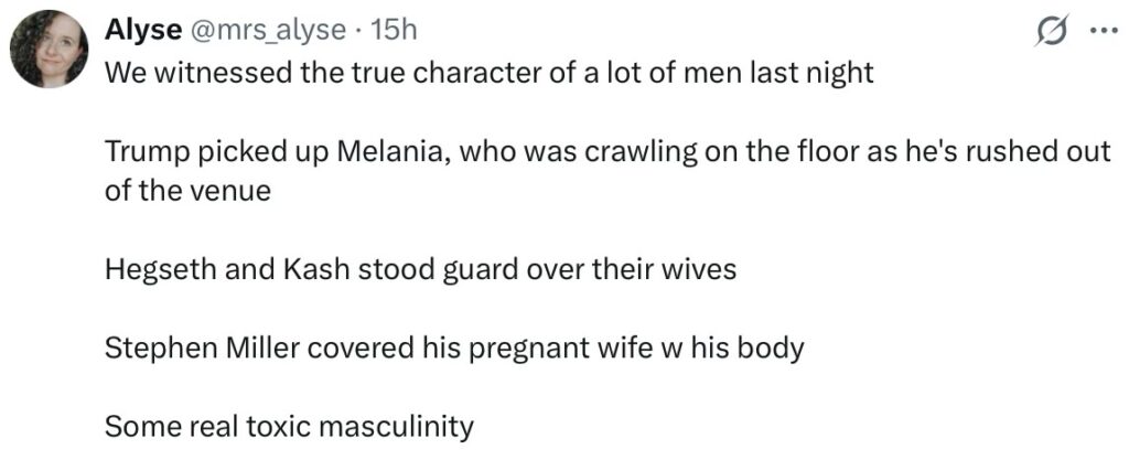 “You can tell a lot about a man about how they instinctively respond when it hits the fan. In this photo, Stephen Miller moves on top of his pregnant wife to protect her. Pete Hegseth stands over his wife, surveying the scene while leaning over, protecting her.”