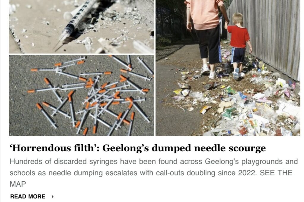 a. The Geelong one, from downunder, southwest of Melbourne … remember that this is a paywall MSM rag. You saw Donny give it to that 60 Mins cow the other day … that’s the MSM worldwide. Why would mum and toddler walk through filth on the ground? Then all those syringes together on the asphalt. I call “contrived”.