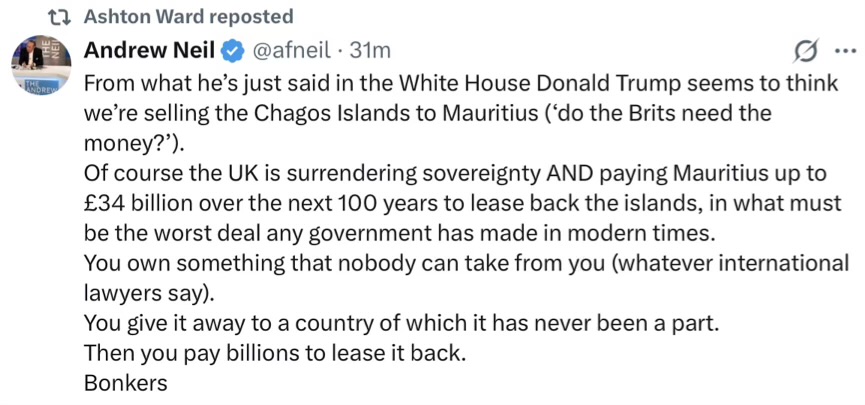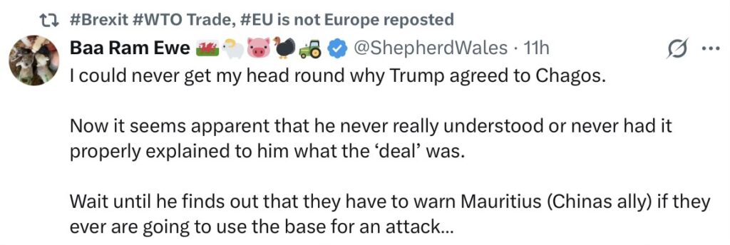 Sky News UK positions itself as the working man’s conservative voice, in a Boris Johnson way before he went full WEF. With that Chagos report, they ran with the Chagos people being “removed”, a fair angle, but playing down what Starmer is doing … the very thing the country’s pundits are on about.