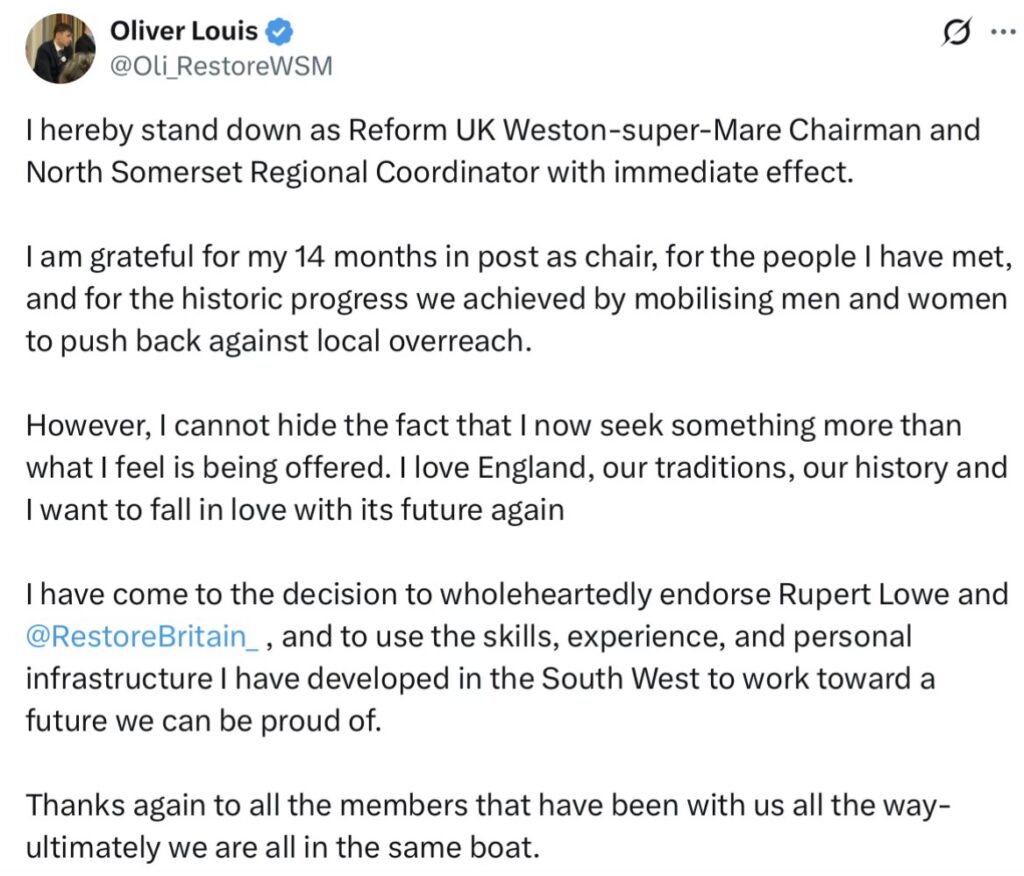 “Some on the ‘woke right’ saw the wind blowing in Reform’s direction and the potential for future career opportunities. Farage’s 3rd go at a ‘more of the same with a few populist tweaks’ Party won’t frighten the horses. Restore has blindsided them.”