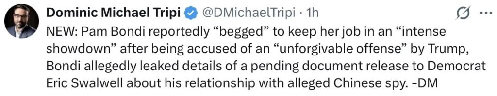 Update (1315ET): That didn’t take long – Bondi is out, according to Fox News and WSJ.