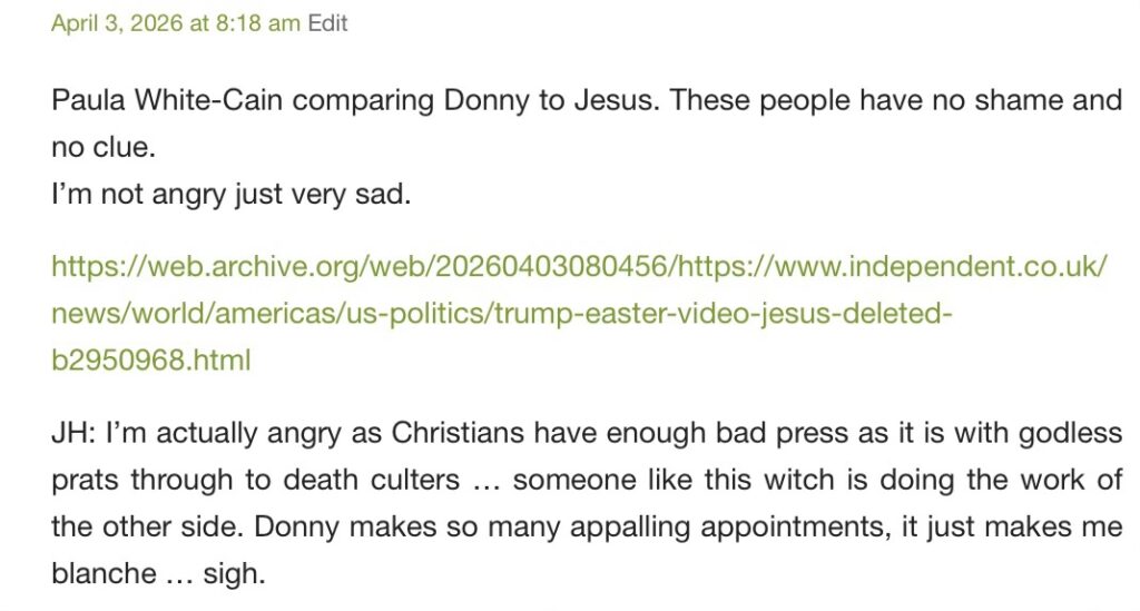 (1012) Chaps and chapesses, Steve and now Penseivat, plus Andy, have got this thread moving under the Last Supper final Thursday post. Can we keep the treatises on things Christian there, under that post … until Sunday coming, at which point we could continue from Sunday post? I’d ordinarily not ask but it would be nice for blogreaders and Xers to have it in one place at a time. Ta. AFAP of course. (1056)