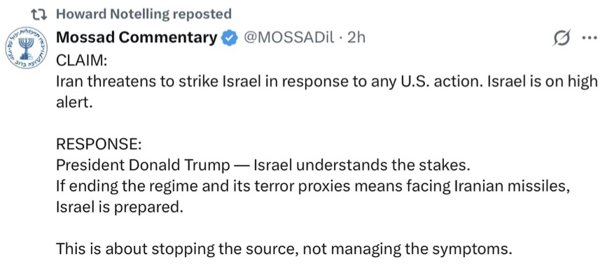 Therefore, if I repost a Mossad sshot below, it is for information in the Iran crisis. DJT is going to have to decide for his people, plus Iran’s, very, very quickly, if he’s capable of it. Reports do seem to indicate it’s quite line ball just now with this godless massacre taking place.