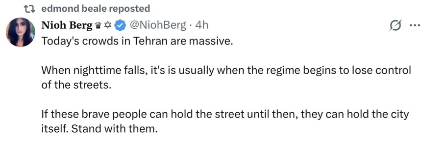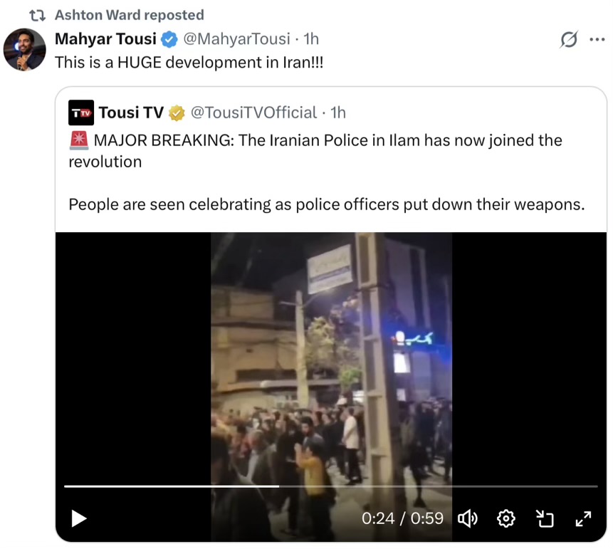 “Iran shut down Wednesday as businesses, universities, and government offices closed across 21 of 31 provinces. Protests are now in their fourth day. Video footage shows intense clashes in Shiraz, Isfahan, Kermanshah, and Tehran. Crowds chanting “Death to Khamenei!” and “Death to the Dictator!” In Fasa, protesters stormed the governor’s office. IRGC forces opened fire. Military helicopters flew overhead. Now unconfirmed reports claim protesters have taken control of Ramhormoz in Khuzestan province and are burning down the local government headquarters. Analysts suggest more towns may be falling to demonstrators, leaving the regime with few options beyond mounting counter-offensives. The regime’s moves: A new central bank chief after the last one resigned. Khamenei appointed an IRGC general wanted by INTERPOL for the 1994 Argentina bombing as deputy commander. President Pezeshkian acknowledged the situation is “extremely difficult and complex.” The economic crisis is severe: inflation, currency collapse, declining living standards. Exiled Crown Prince Reza Pahlavi: “The current regime has reached the end of the road.” Source: Fox News, NYP, @WalidPhares … @visegrad24“