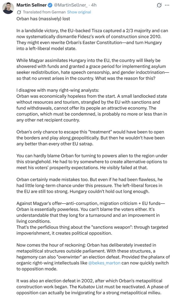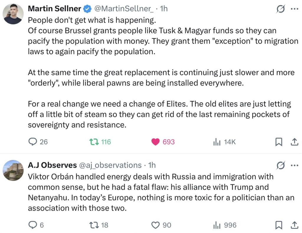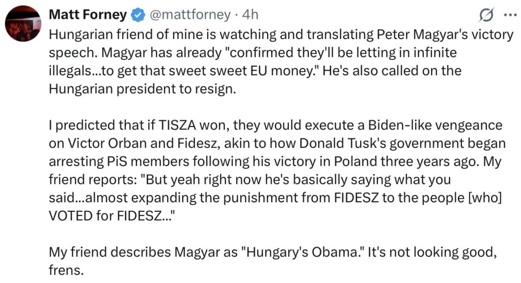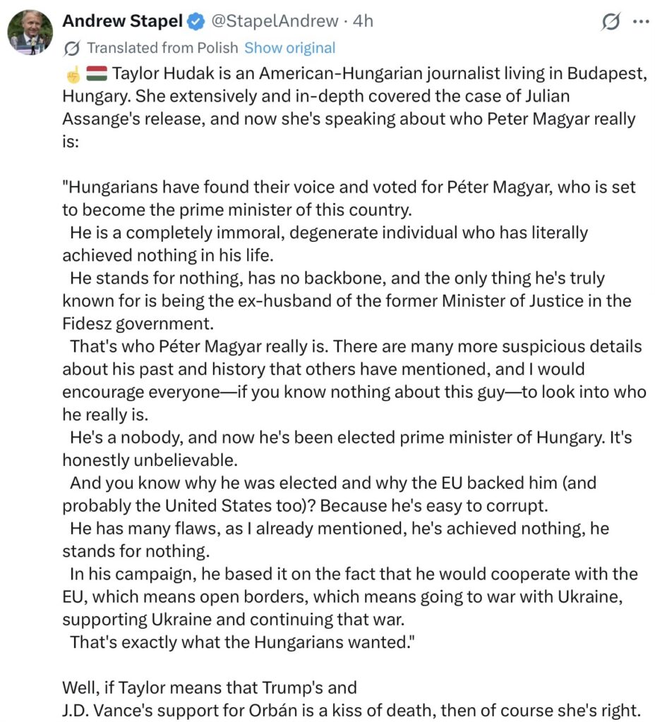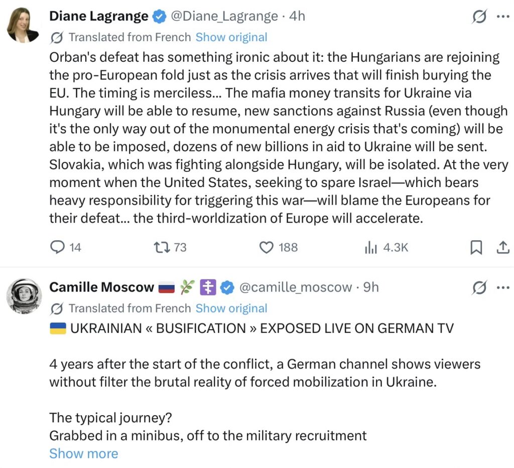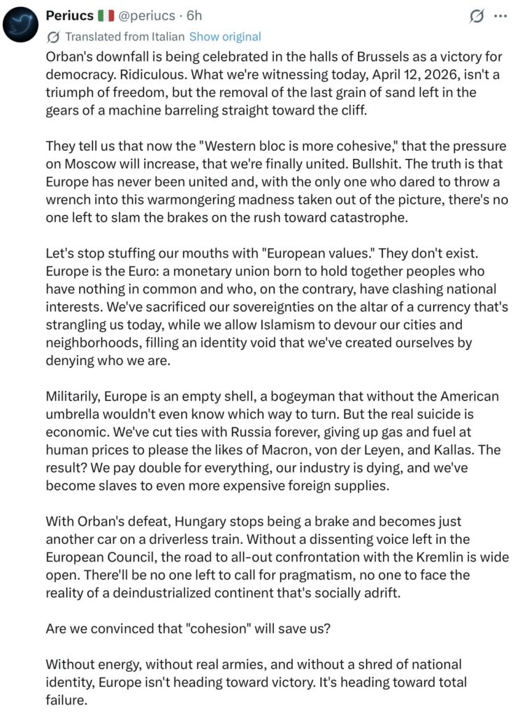 Sometimes, a blog model does not meet the needs of the incoming copy. I’ve just reduced around 20 snippets to 14, attempting to table an overview of mainly European opinion on the events in Hungary. Before that, just now, I’ve been skimming through all the other X copy for the UK, US, antipodes, Canada and about the only immediate topics at 0357 BST are Trump and Hormuz, plus Ireland … more on those later.