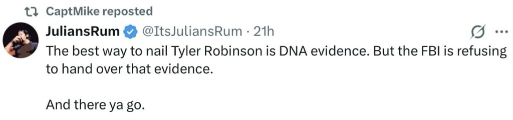 Bullet Fragment From Charlie Kirk’s Autopsy Identified as .30 Caliber that Matches Rifle Used by Alleged Assassin Tyler Robinson (JH: Yeah yeah, the other one has bells on it.)